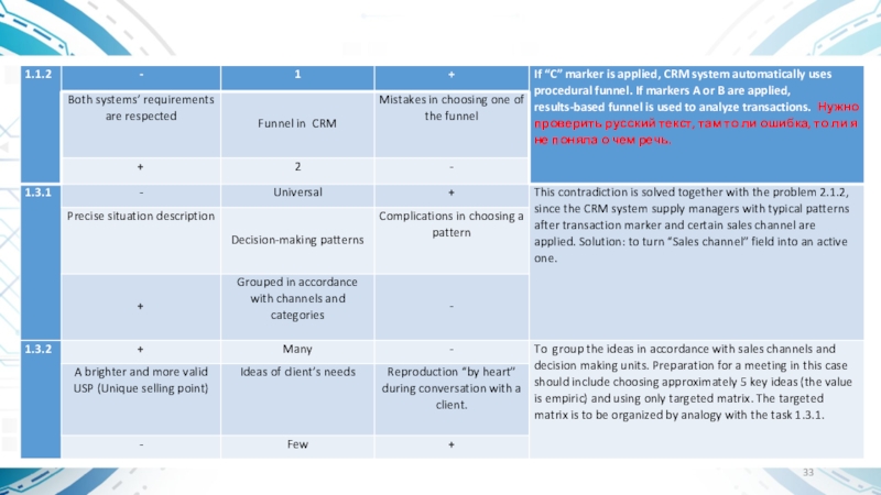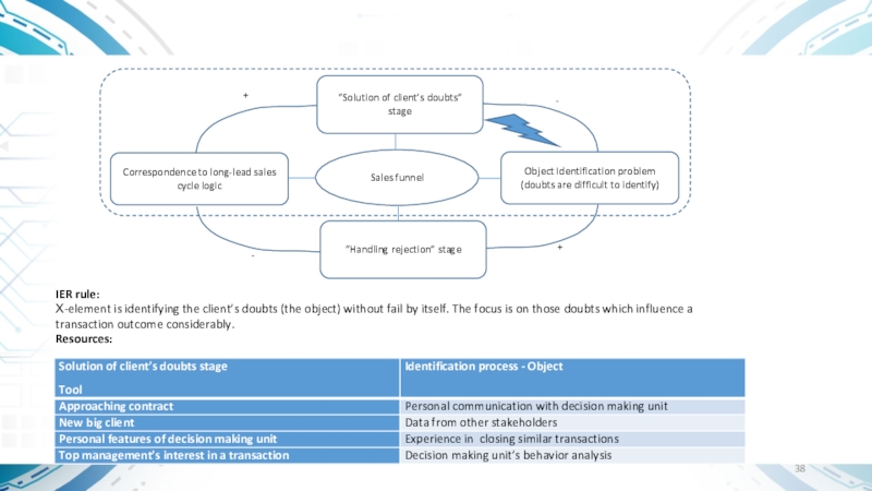 If transaction is big, the requirements of decision making people are to be studied thoroughly at “Needs recognition” stage. This should be done even more attentively in case current transaction is considerably bigger than the client’s average or the client came from a competitor. Afterwards, while transaction is in progress we can trace deviations from these requirements, which will be reliable indicator of doubts.