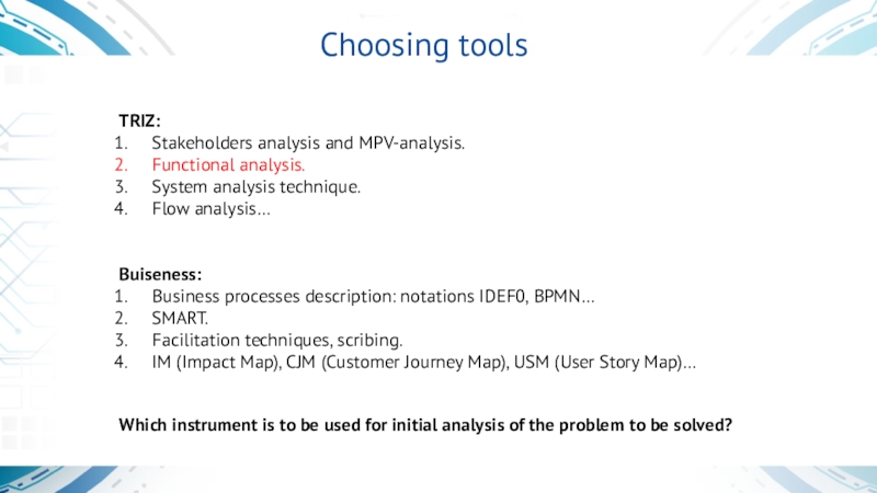 Which instrument is to be used for initial analysis of the problem to be solved?