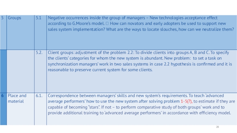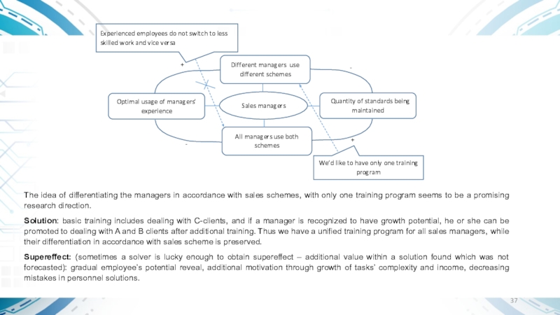 Supereffect: (sometimes a solver is lucky enough to obtain supereffect – additional value within a solution found which was not forecasted): gradual employee’s potential reveal, additional motivation through growth of tasks’ complexity and income, decreasing mistakes in personnel solutions.