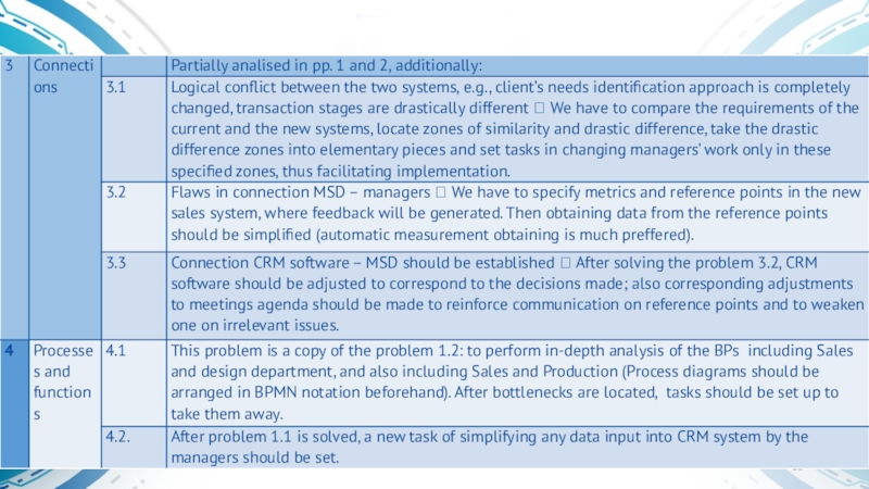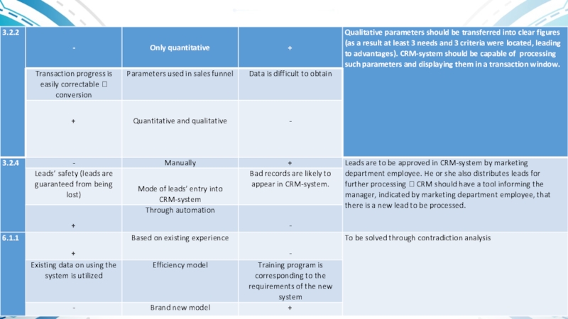 If the client is new and a big transaction is being negotiated we analyze personal features of the contract partner and record them in “contact” window of CRM system. The data are: personality type in accordance with DISC model (also Adizes-Madanes Enneagram types model can be used), interests, bihavioural peculiarities. The managers are trained with detailed cases’ analysis and examples.
