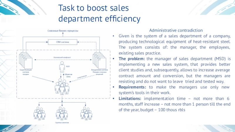 The problem: the manager of sales department (MSD) is implementing a new sales system, that provides better client studies and, subsequently, allows to increase average contract amount and conversion, but the managers are resisting and do not want to leave tried and tested way.