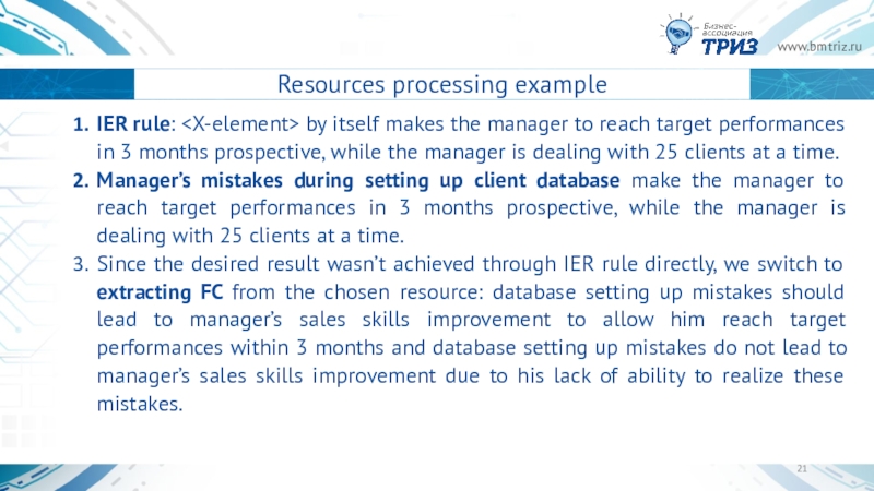 Since the desired result wasn’t achieved through IER rule directly, we switch to extracting FC from the chosen resource: database setting up mistakes should lead to manager’s sales skills improvement to allow him reach target performances within 3 months and database setting up mistakes do not lead to manager’s sales skills improvement due to his lack of ability to realize these mistakes.