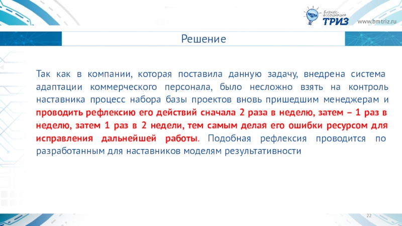 набора базы проектов вновь пришедшим менеджерам и проводить рефлексию его действий сначала 2 раза в неделю, затем – 1 раз в неделю, затем 1 раз в 2 недели, тем самым делая его ошибки ресурсом для исправления дальнейшей работы. Подобная рефлексия проводится по разработанным для наставников моделям результативности