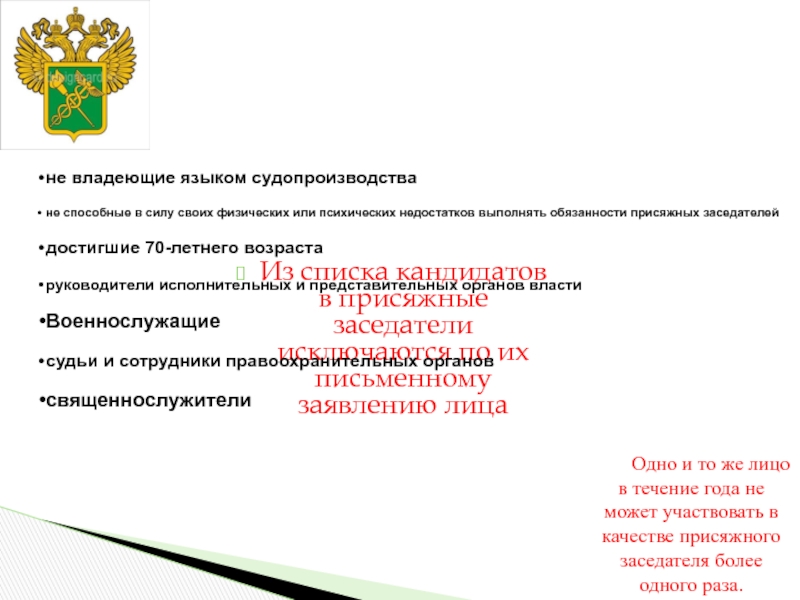 Одно и то же лицо в течение года не может участвовать в качестве присяжного заседателя более одного раза.