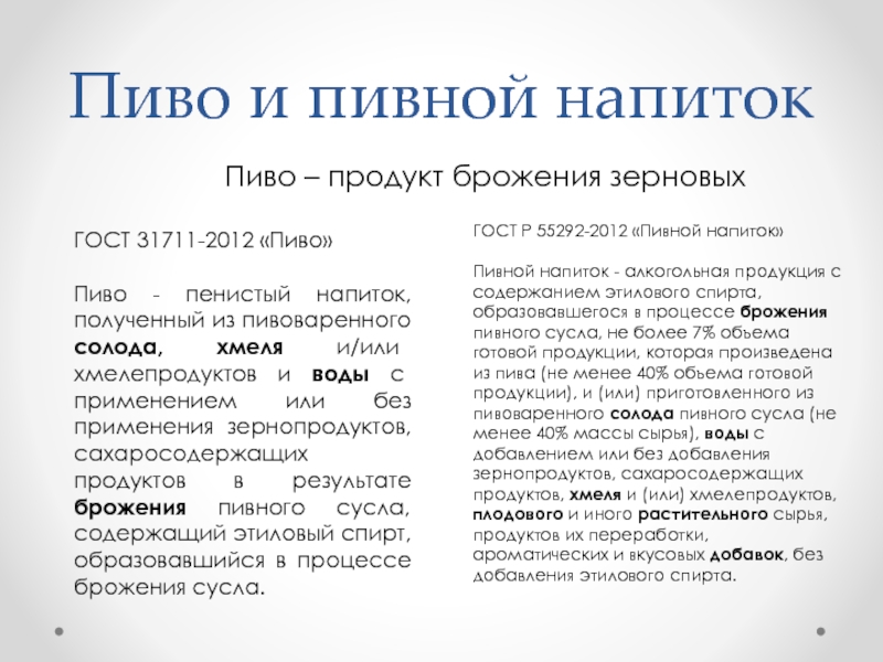 Пивной напиток - алкогольная продукция с содержанием этилового спирта, образовавшегося в процессе брожения пивного сусла, не более 7% объема готовой продукции, которая произведена из пива (не менее 40% объема готовой продукции), и (или) приготовленного из пивоваренного солода пивного сусла (не менее 40% массы сырья), воды с добавлением или без добавления зернопродуктов, сахаросодержащих продуктов, хмеля и (или) хмелепродуктов, плодового и иного растительного сырья, продуктов их переработки, ароматических и вкусовых добавок, без добавления этилового спирта.