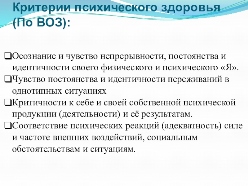 Слайд 3Критерии психического здоровья (По ВОЗ):