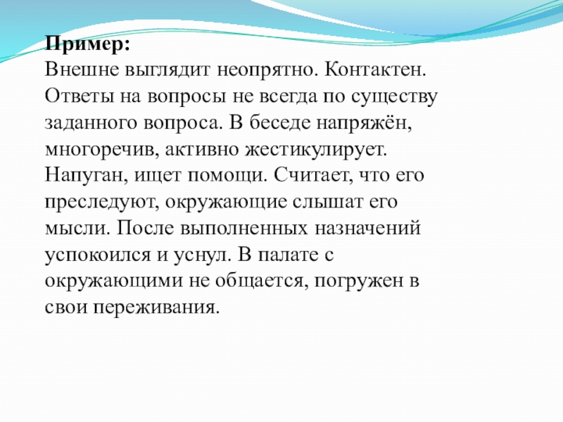 существу заданного вопроса. В беседе напряжён, многоречив, активно жестикулирует. Напуган,
