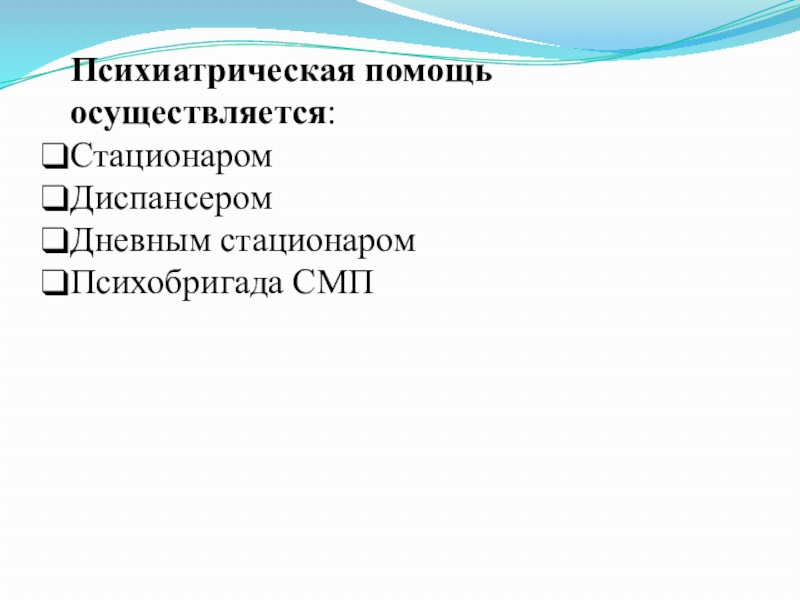 Слайд 17Психиатрическая помощь осуществляется: