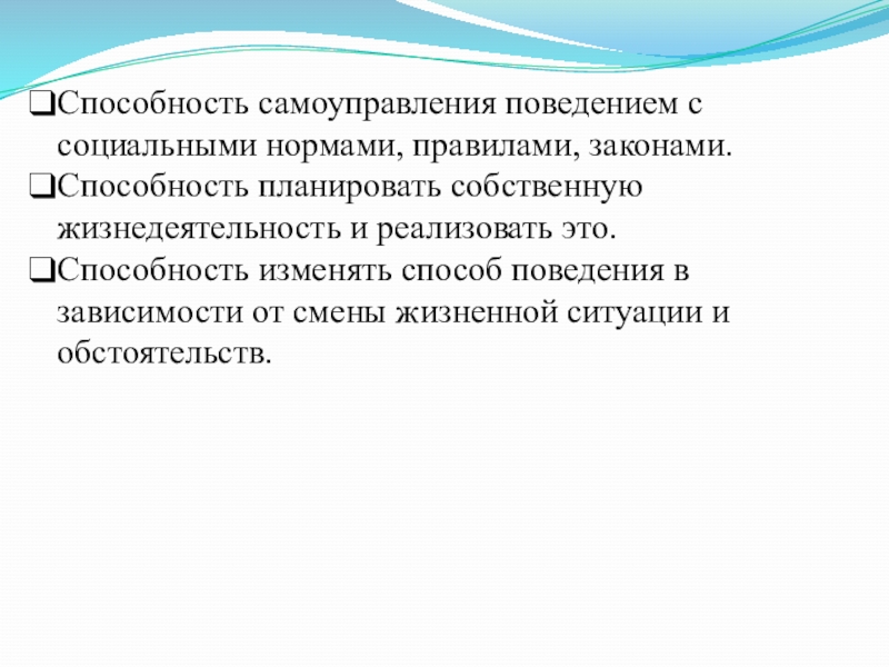Слайд 4Способность самоуправления поведением с социальными нормами, правилами, законами.