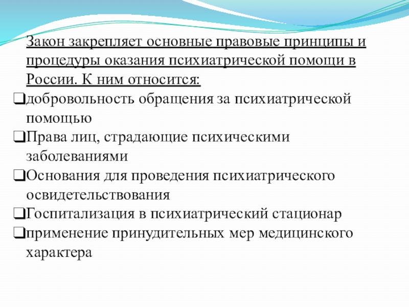 Слайд 7Закон закрепляет основные правовые принципы и процедуры оказания психиатрической помощи