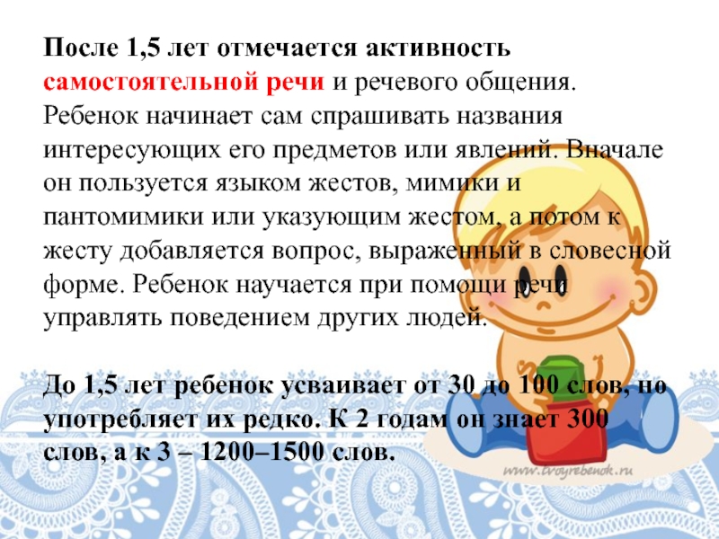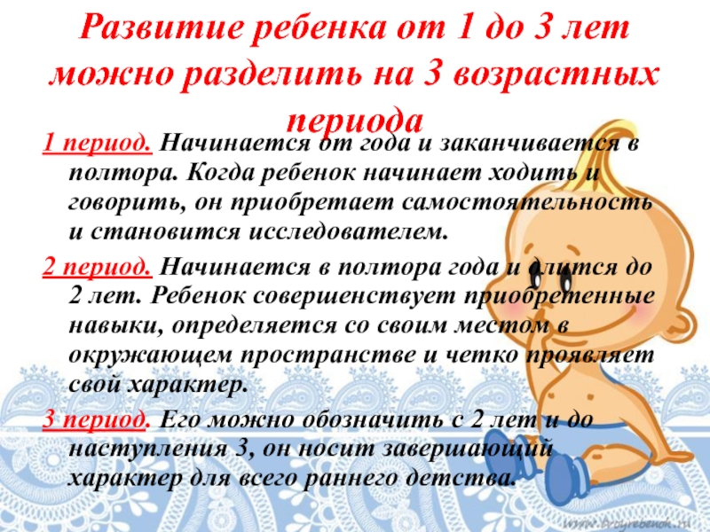 матери – и наступает уже раннее детство. Это связано с тем, что у ребенка не только возникают новые физические возможности, но и интенсивно развиваются психические функции, затем появляются первоначальные основы (зачатки) самосознания.