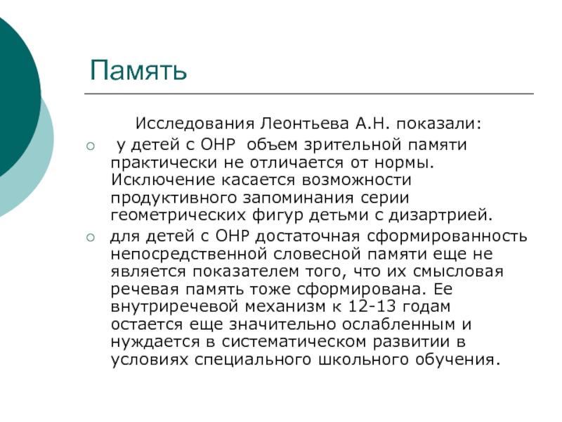 Память Исследования Леонтьева А.Н. показали: у детей с ОНР объем зрительной памяти практически не отличается от нормы.