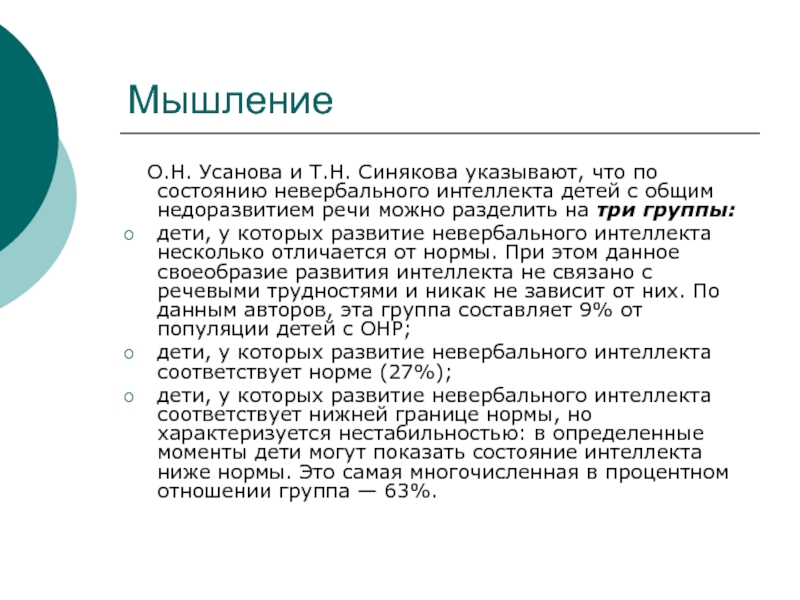 Мышление   О.Н. Усанова и Т.Н. Синякова указывают, что по состоянию невербального интеллекта детей с общим