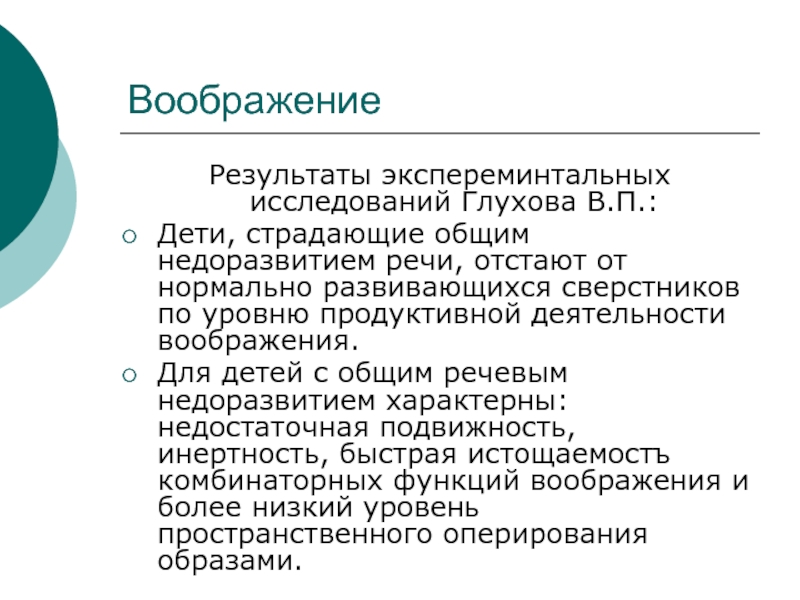 Воображение Результаты экспереминтальных исследований Глухова В.П.:Дети, страдающие общим недоразвитием речи, отстают от нормально развивающихся сверстников по уровню