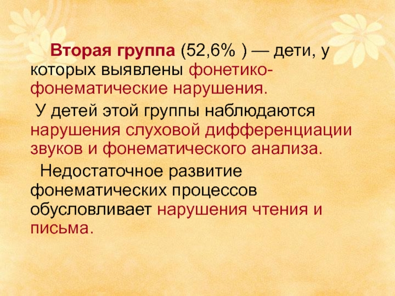 Слайд 7 Вторая группа (52,6% ) — дети, у которых выявлены фонетико-фонематические