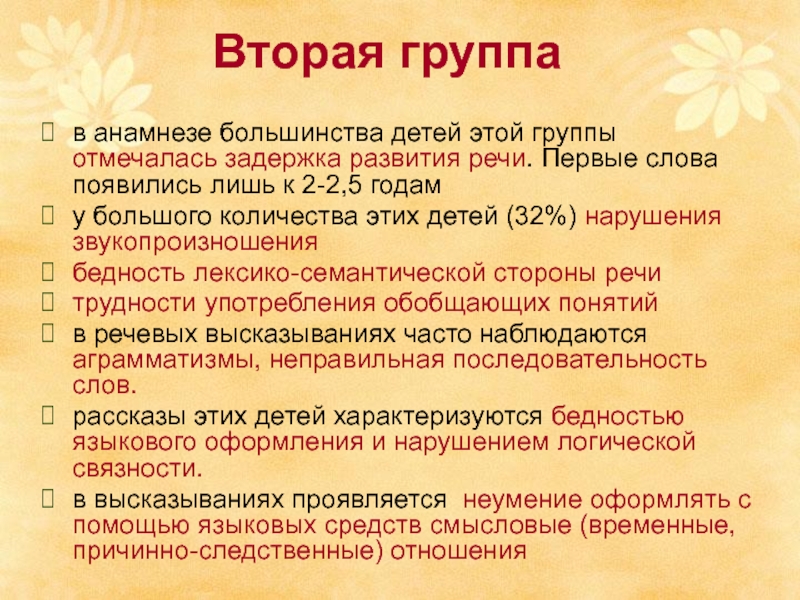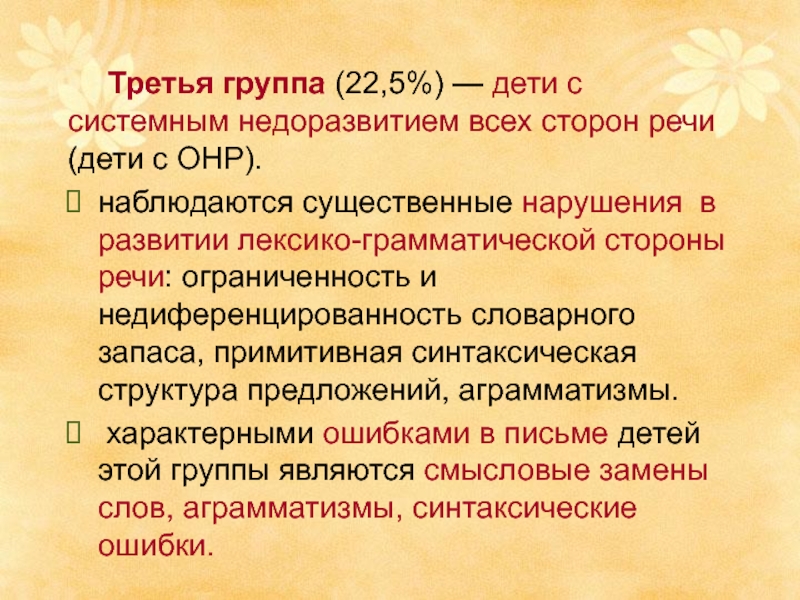 Слайд 8 Третья группа (22,5%) — дети с системным недоразвитием всех сторон