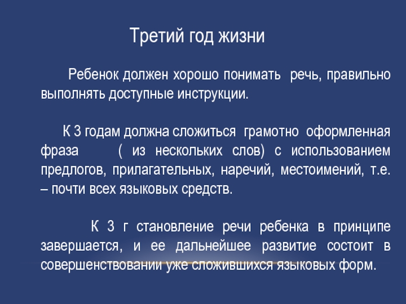К 3 г становление речи ребенка в принципе завершается, и ее дальнейшее развитие состоит в совершенствовании уже сложившихся языковых форм.