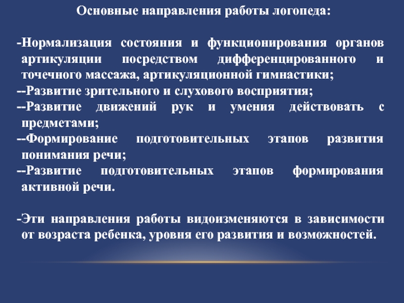 Эти направления работы видоизменяются в зависимости от возраста ребенка, уровня его развития и возможностей.