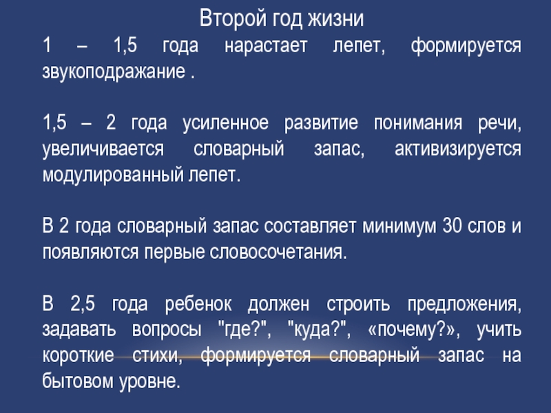 1,5 – 2 года усиленное развитие понимания речи, увеличивается словарный