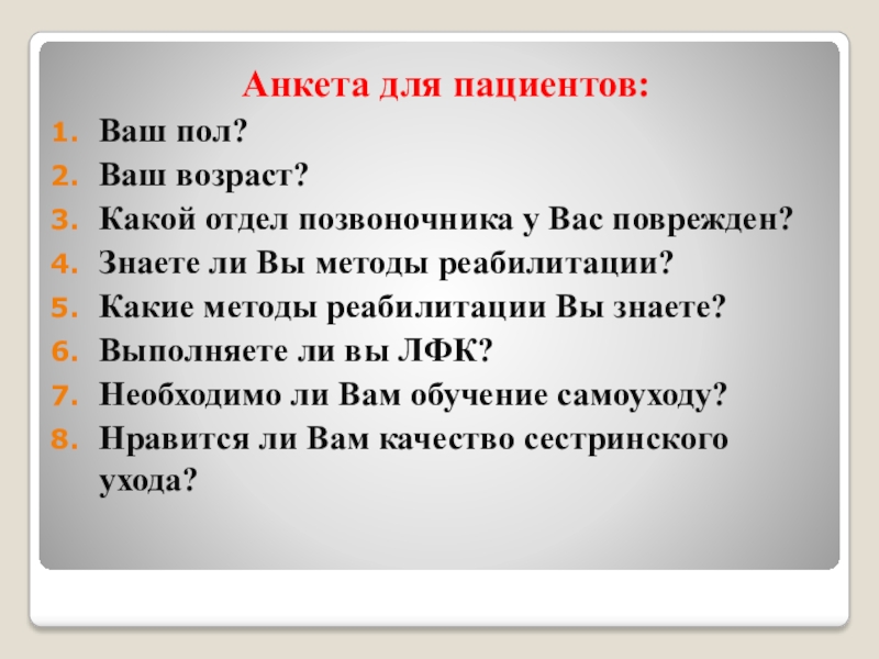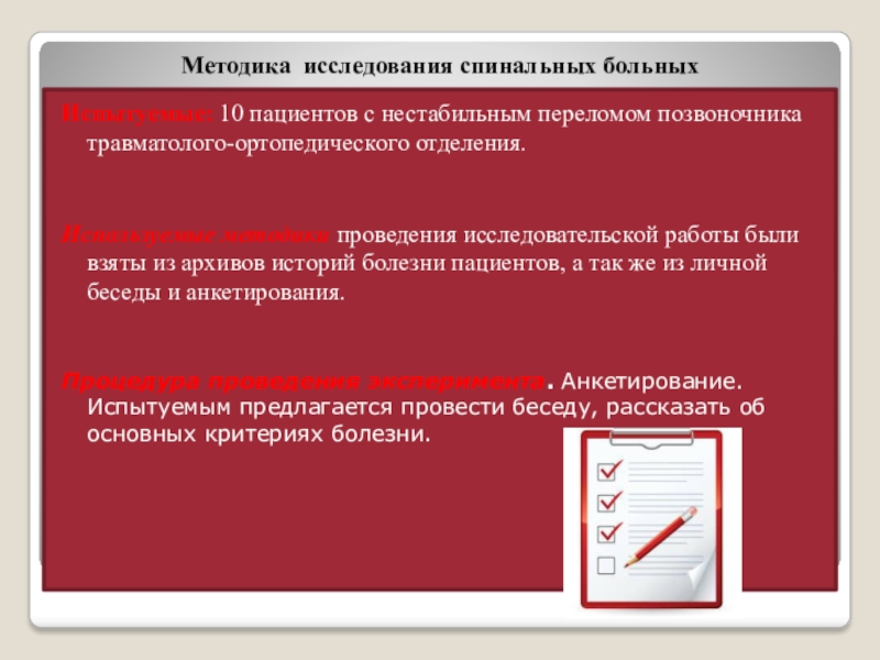 процесс лечения и уход за спинальными больными.Предметом исследования является роль медицинской сестры при уходе за пациентом с повреждением спинного мозга.
