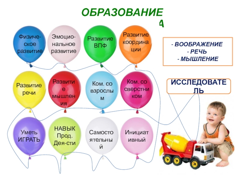 ОБРАЗОВАНИЕ ДОШКОЛЬНИКАФизиче-ское развитиеЭмоцио-нальное развитиеРазвитие ВПФРазвитие координации Развитие речиРазвитие мышленияКом. со взрослымКом. со сверстникомУметь ИГРАТЬНАВЫК Прод. Дея-стиСамостоятельныйИнициативныйИССЛЕДОВАТЕЛЬ ВООБРАЖЕНИЕ
