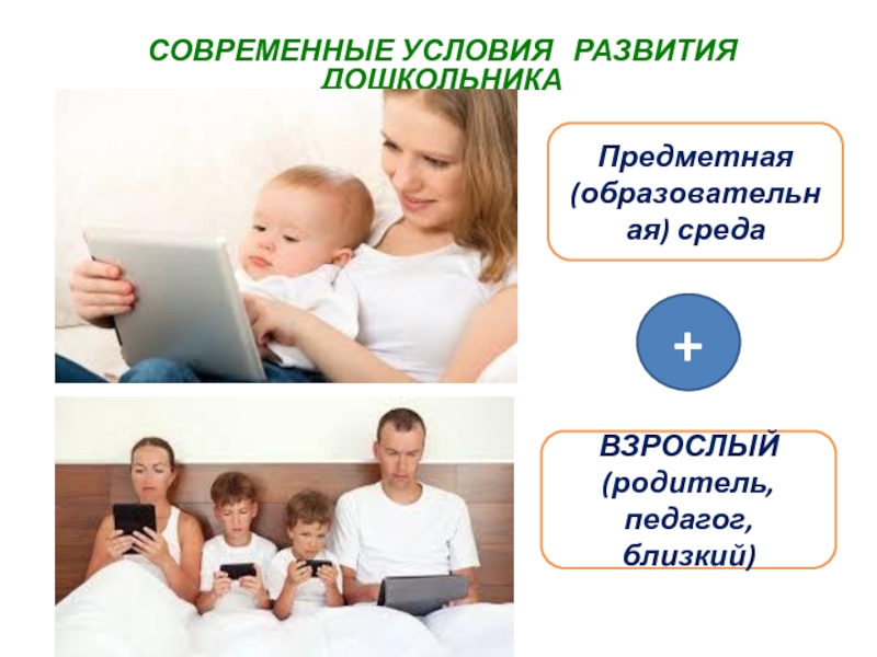 СОВРЕМЕННЫЕ УСЛОВИЯ  РАЗВИТИЯ ДОШКОЛЬНИКАПредметная (образовательная) среда+ВЗРОСЛЫЙ (родитель, педагог, близкий)