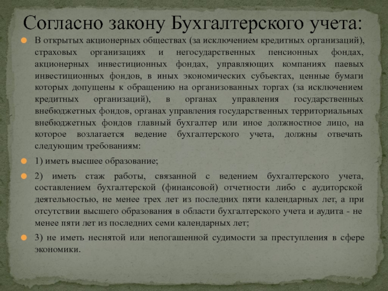 инвестиционных фондов, в иных экономических субъектах, ценные бумаги которых допущены к обращению на организованных торгах (за исключением кредитных организаций), в органах управления государственных внебюджетных фондов, органах управления государственных территориальных внебюджетных фондов главный бухгалтер или иное должностное лицо, на которое возлагается ведение бухгалтерского учета, должны отвечать следующим требованиям: