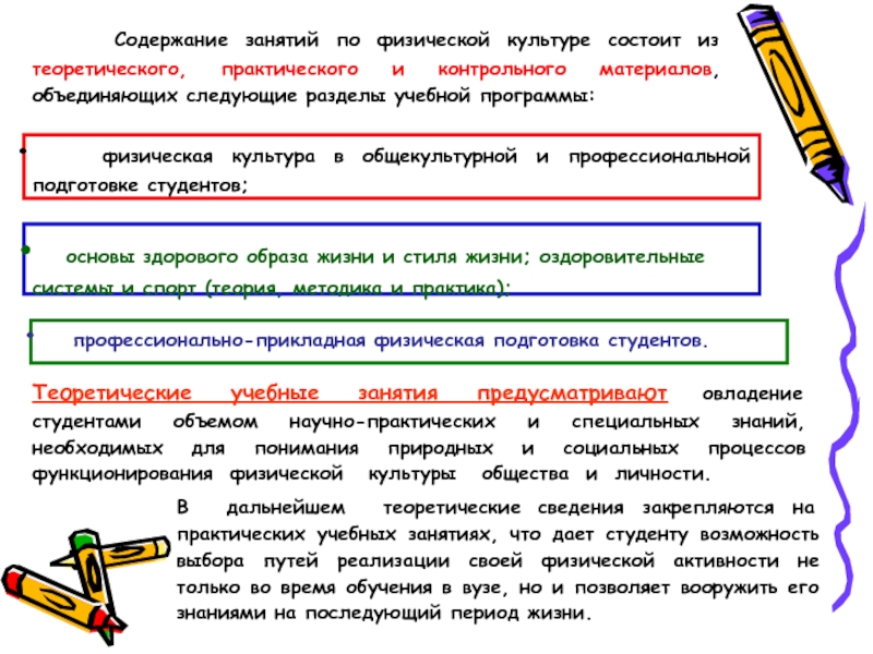 Теоретические учебные занятия предусматривают овладение студентами объемом научно-практических и специальных знаний, необходимых для понимания природных и социальных процессов функционирования физической культуры общества и личности.