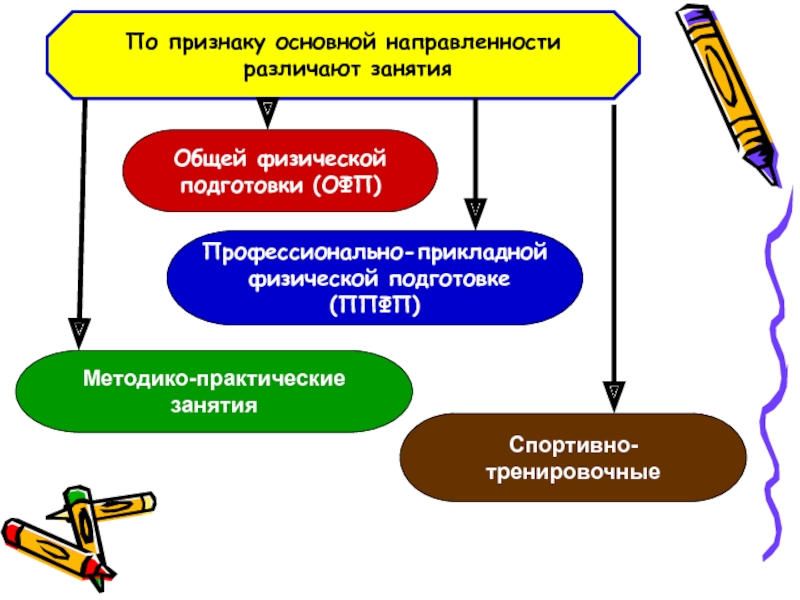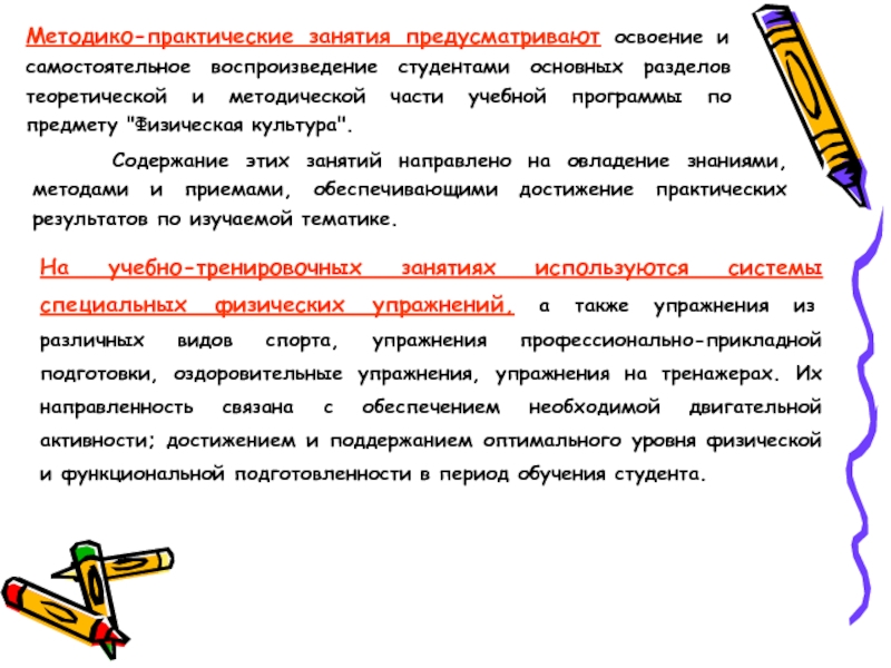 На учебно-тренировочных занятиях используются системы специальных физических упражнений, а также упражнения из различных видов спорта, упражнения профессионально-прикладной подготовки, оздоровительные упражнения, упражнения на тренажерах. Их направленность связана с обеспечением необходимой двигательной активности; достижением и поддержанием оптимального уровня физической и функциональной подготовленности в период обучения студента.