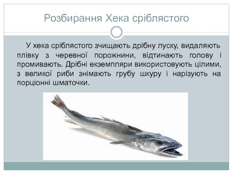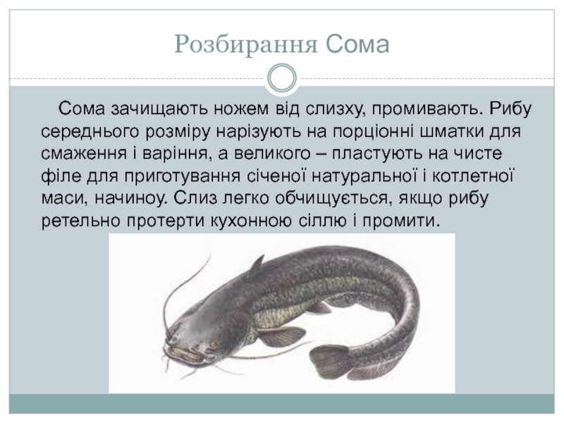 і варіння, а великого – пластують на чисте філе для приготування січеної натуральної і котлетної маси, начиноу. Слиз легко обчищується, якщо рибу ретельно протерти кухонною сіллю і промити.
