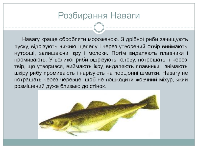 виймають нутрощі, залишаючи ікру і молоки. Потім видаляють плавники і промивають. У великої риби відрізують голову, потрошать її через твір, що утворився, виймають ікру, видаляють плавники і знімають шкіру рибу промивають і нарізують на порціонні шматки. Навагу не потрашать через черевце, щоб не пошкодити жовчний міхур, який розміщений дуже близько до стінок.
