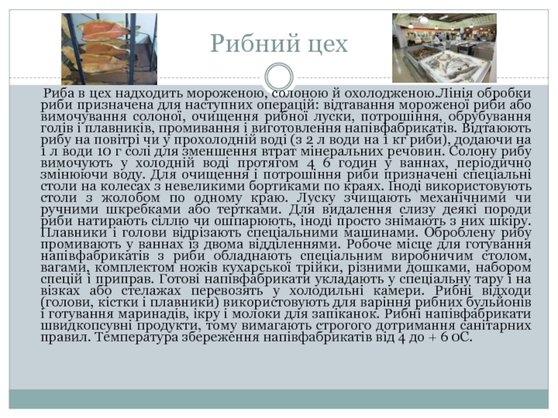 мороженої риби або вимочування солоної, очищення рибної луски, потрошіння, обрубування голів і плавників, промивання і виготовлення напівфабрикатів. Відтаюють рибу на повітрі чи у прохолодній воді (з 2 л води на 1 кг риби), додаючи на 1 л води 10 г солі для зменшення втрат мінеральних речовин. Солону рибу вимочують у холодній воді протягом 4 6 годин у ваннах, періодично змінюючи воду. Для очищення і потрошіння риби призначені спеціальні столи на колесах з невеликими бортиками по краях. Іноді використовують столи з жолобом по одному краю. Луску зчищають механічними чи ручними шкребками або тертками. Для видалення слизу деякі породи риби натирають сіллю чи ошпарюють, іноді просто знімають з них шкіру. Плавники і голови відрізають спеціальними машинами. Оброблену рибу промивають у ваннах із двома відділеннями. Робоче місце для готування напівфабрикатів з риби обладнають спеціальним виробничим столом, вагами, комплектом ножів кухарської трійки, різними дошками, набором спецій і приправ. Готові напівфабрикати укладають у спеціальну тару і на візках або стелажах перевозять у холодильні камери. Рибні відходи (голови, кістки і плавники) використовують для варіння рибних бульйонів і готування маринадів, ікру і молоки для запіканок. Рибні напівфабрикати швидкопсувні продукти, тому вимагають строгого дотримання санітарних правил. Температура збереження напівфабрикатів від 4 до + 6 0С.