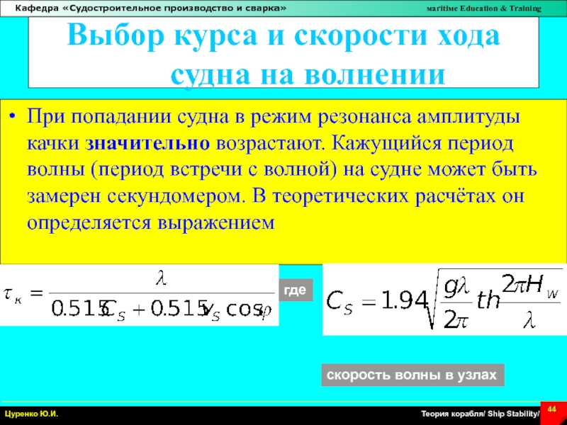 (период встречи с волной) на судне может быть замерен секундомером. В теоретических расчётах он определяется выражением