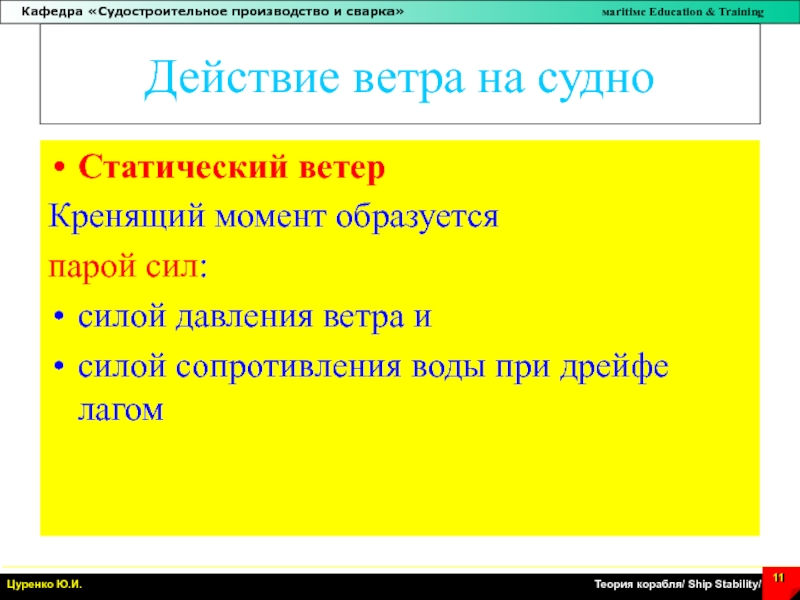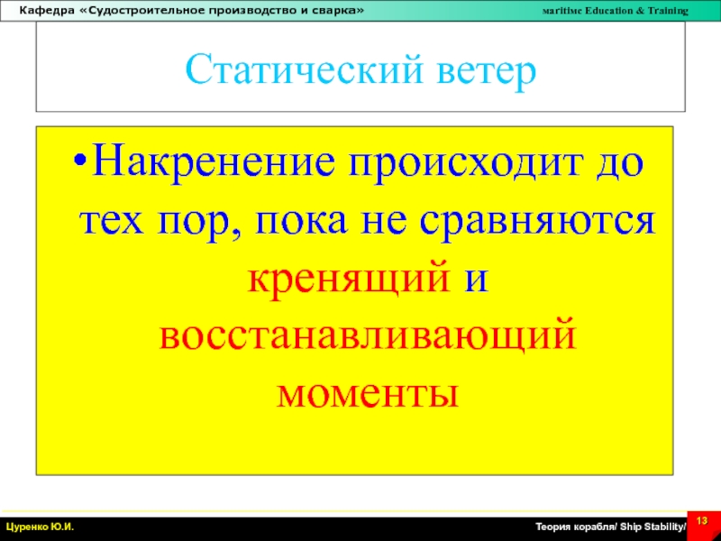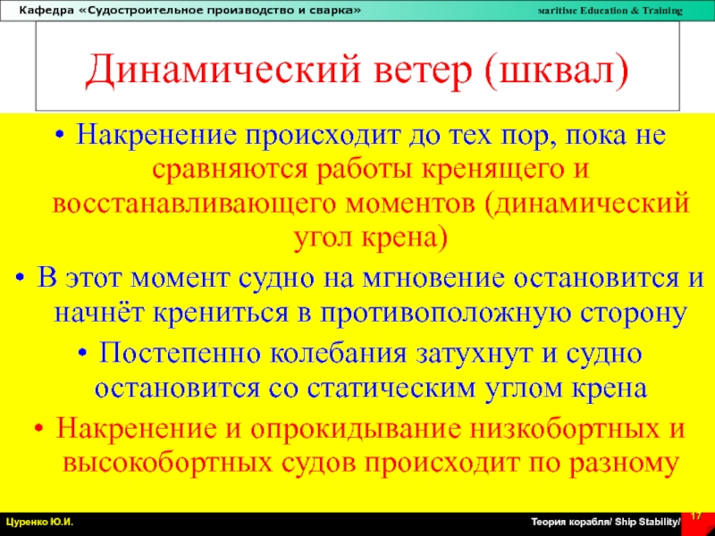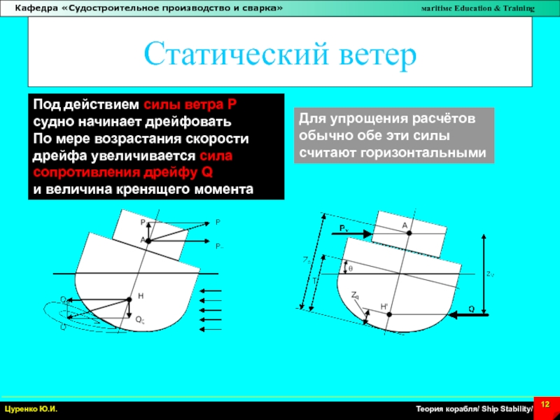Слайд 14Накренение и опрокидывание судна статическим ветром