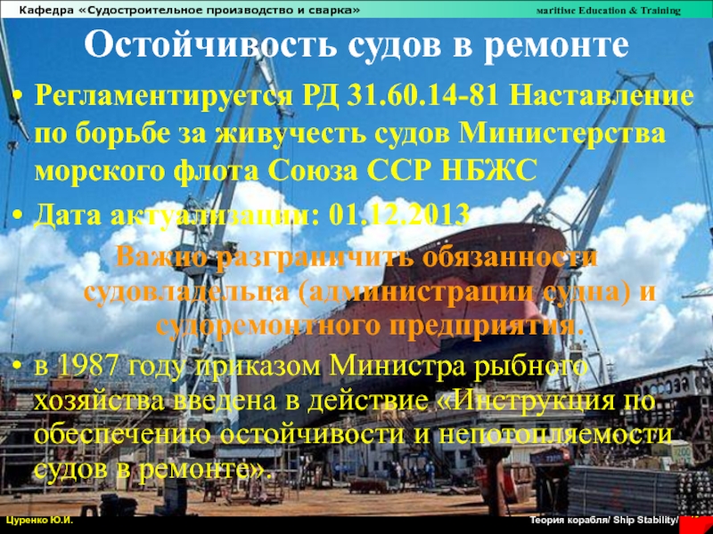 в 1987 году приказом Министра рыбного хозяйства введена в действие «Инструкция по обеспечению остойчивости и непотопляемости судов в ремонте».