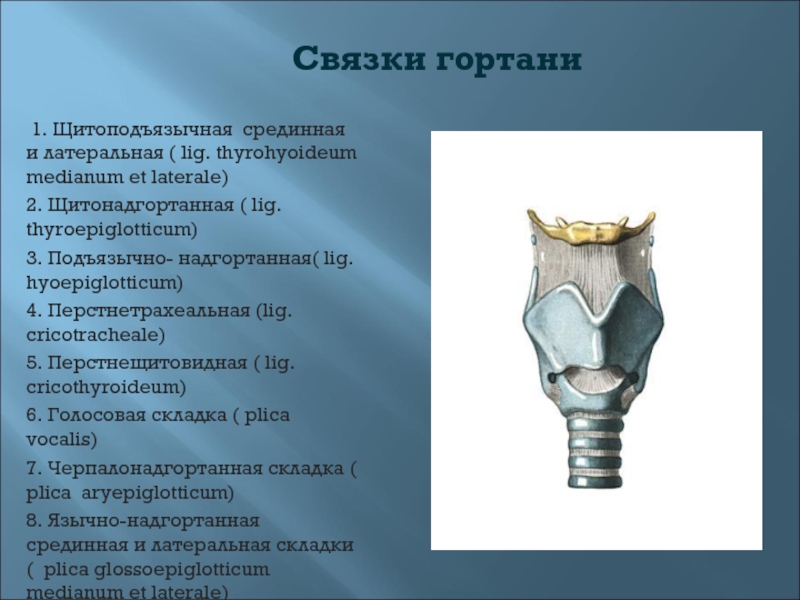 1. Щитоподъязычная срединная и латеральная ( lig. thyrohyoideum medianum et laterale)