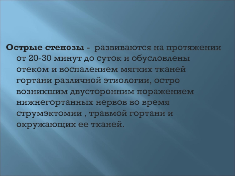 Слайд 19Острые стенозы - развиваются на протяжении от 20-30 минут до