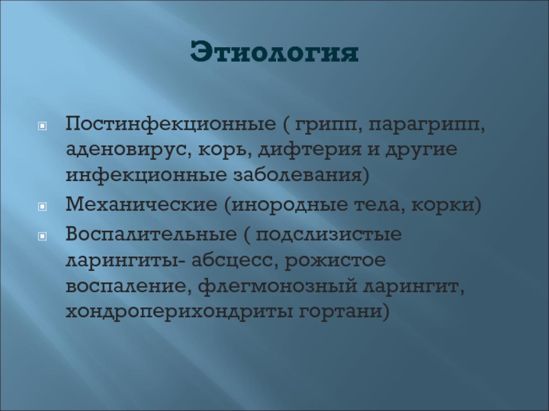 Воспалительные ( подслизистые ларингиты- абсцесс, рожистое воспаление,