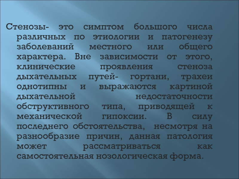 проявления стеноза дыхательных путей- гортани, трахеи однотипны и выражаются картиной дыхательной недостаточности обструктивного типа, приводящей к механической гипоксии. В силу последнего обстоятельства, несмотря на разнообразие причин, данная патология может рассматриваться как самостоятельная нозологическая форма.