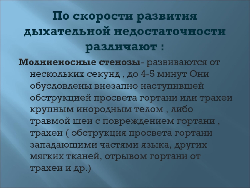 Слайд 18По скорости развития дыхательной недостаточности различают :
