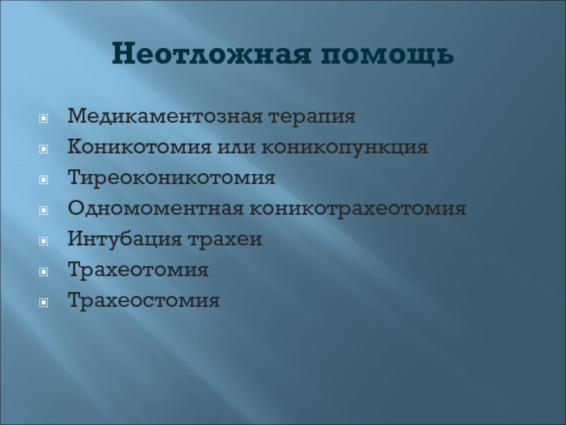 Слайд 31Неотложная помощь при молниеносных стенозах гортани
