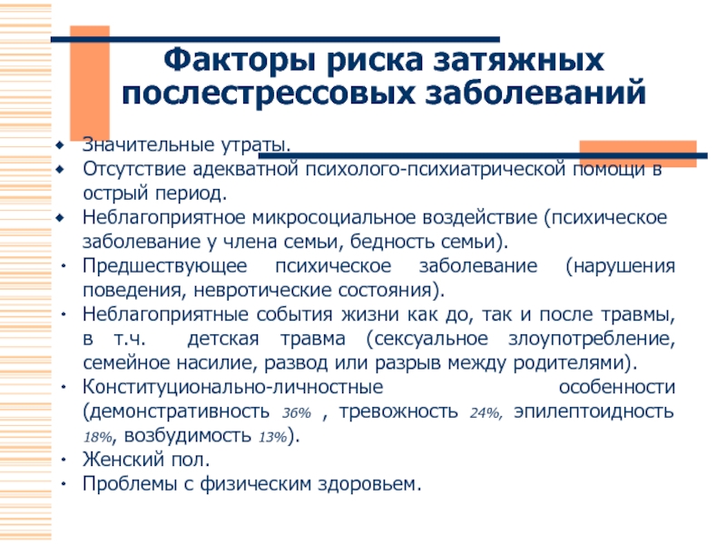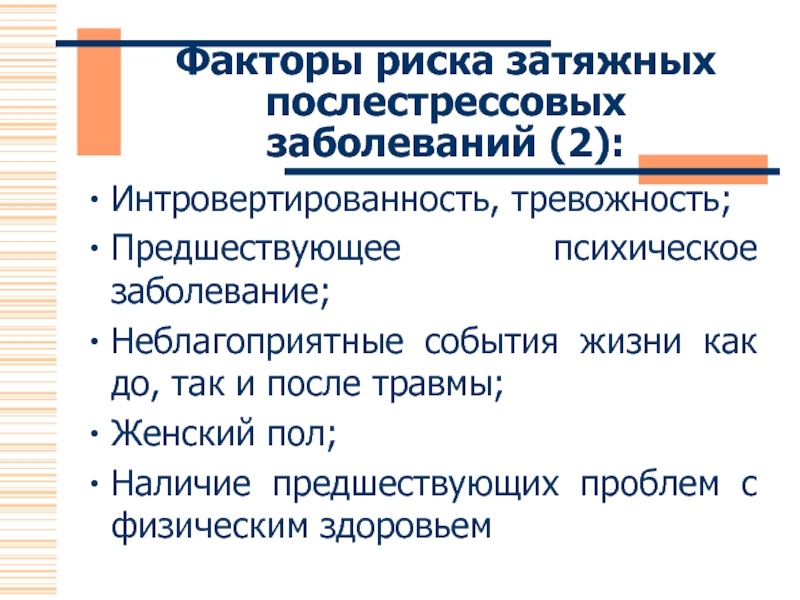 Слайд 16Факторы риска затяжных послестрессовых заболеваний