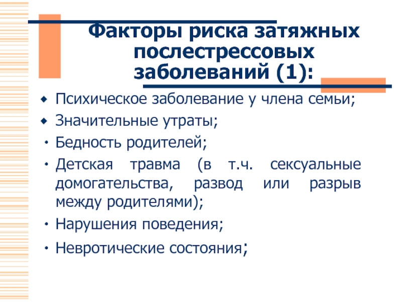 Слайд 19Факторы риска затяжных послестрессовых заболеваний (1):
