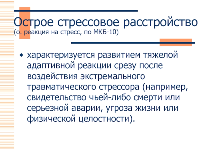 Слайд 2Острое стрессовое расстройство (о. реакция на стресс, по МКБ-10)