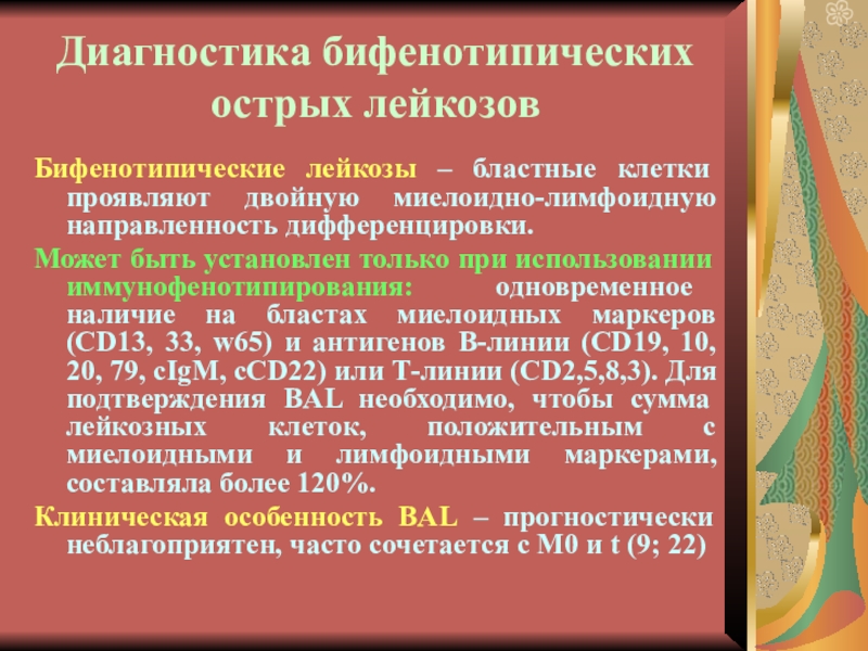 наличие на бластах миелоидных маркеров (CD13, 33, w65) и антигенов В-линии (CD19, 10, 20, 79, сIgM, cCD22) или Т-линии (CD2,5,8,3). Для подтверждения BAL необходимо, чтобы сумма лейкозных клеток, положительным с миелоидными и лимфоидными маркерами, составляла более 120%.