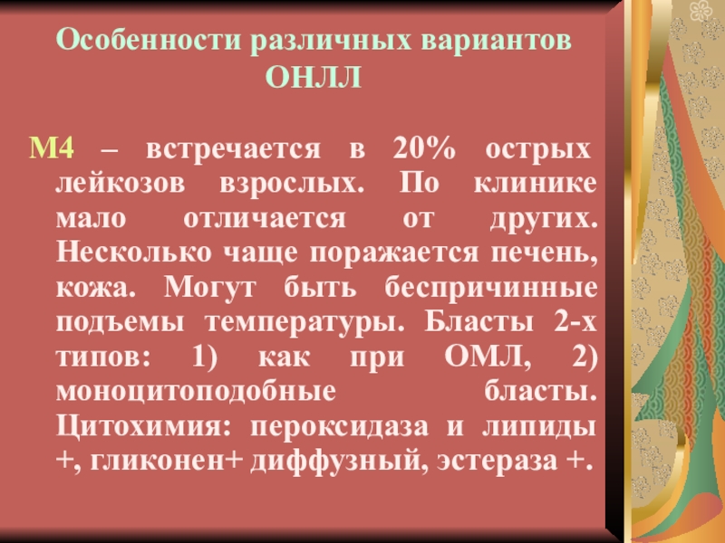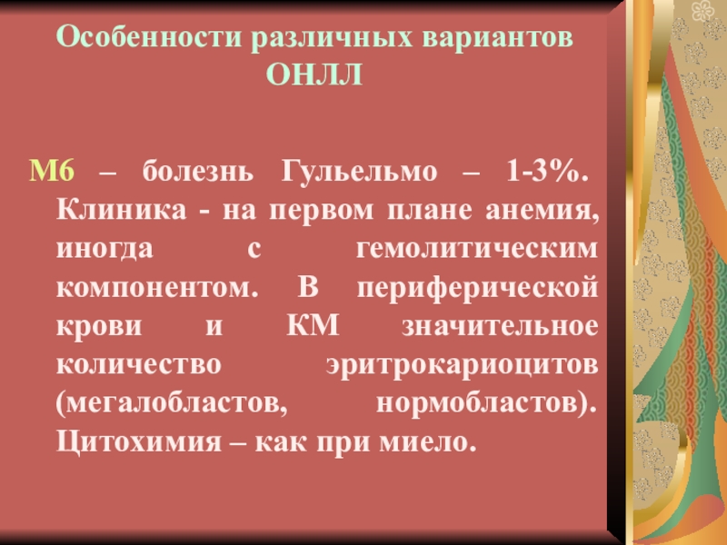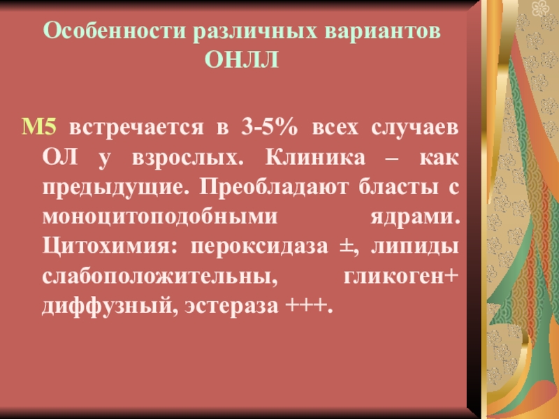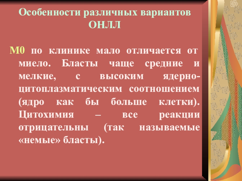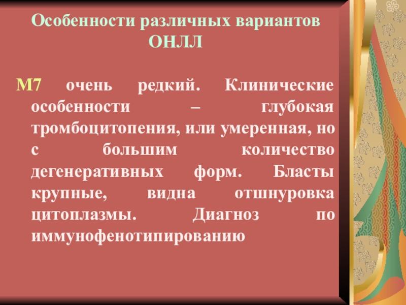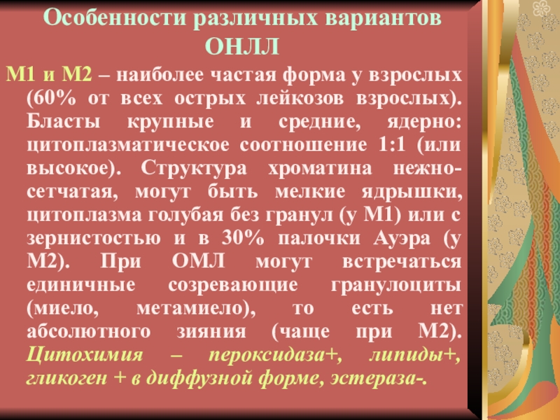 Варианты ОНЛЛ, требующие иммунофеноти-пирования: М0, М6 и М7 (10% всех наблюдений ).