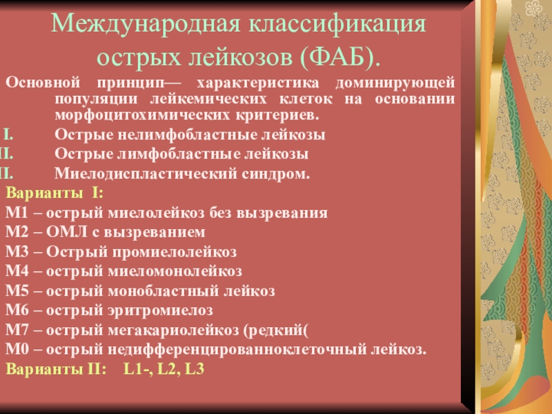 Слайд 11Международная классификация острых лейкозов (ФАБ).