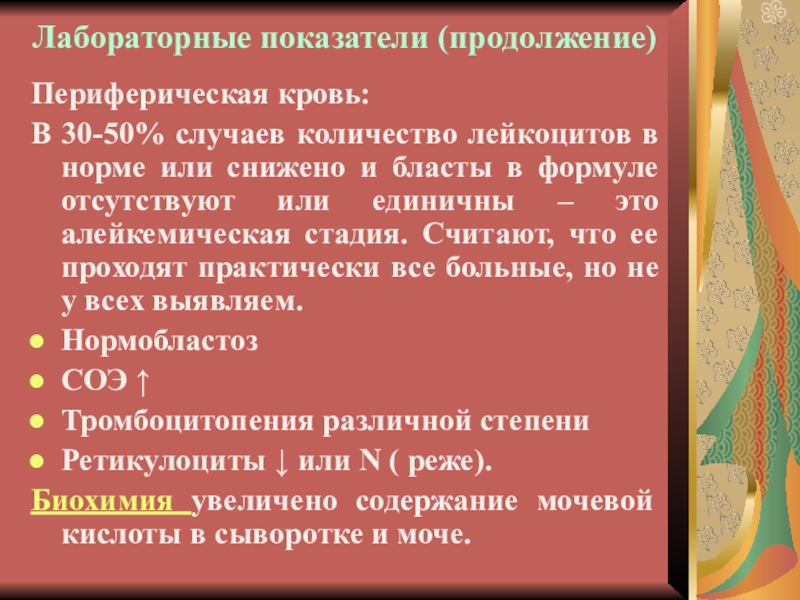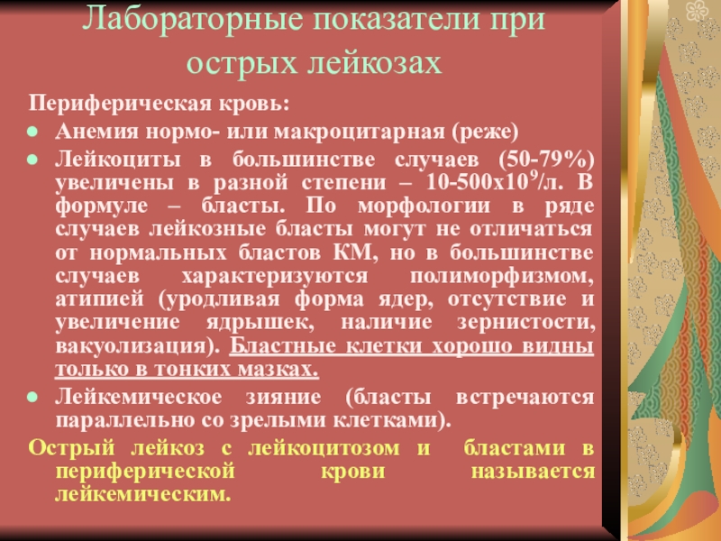 Слайд 5Лабораторные показатели при острых лейкозах