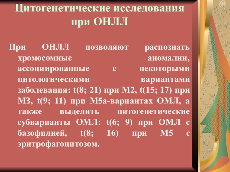 Слайд 30Цитогенетические исследования при ОНЛЛ