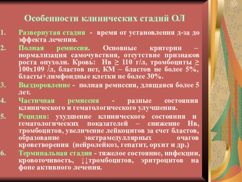 Слайд 9Особенности клинических стадий ОЛ